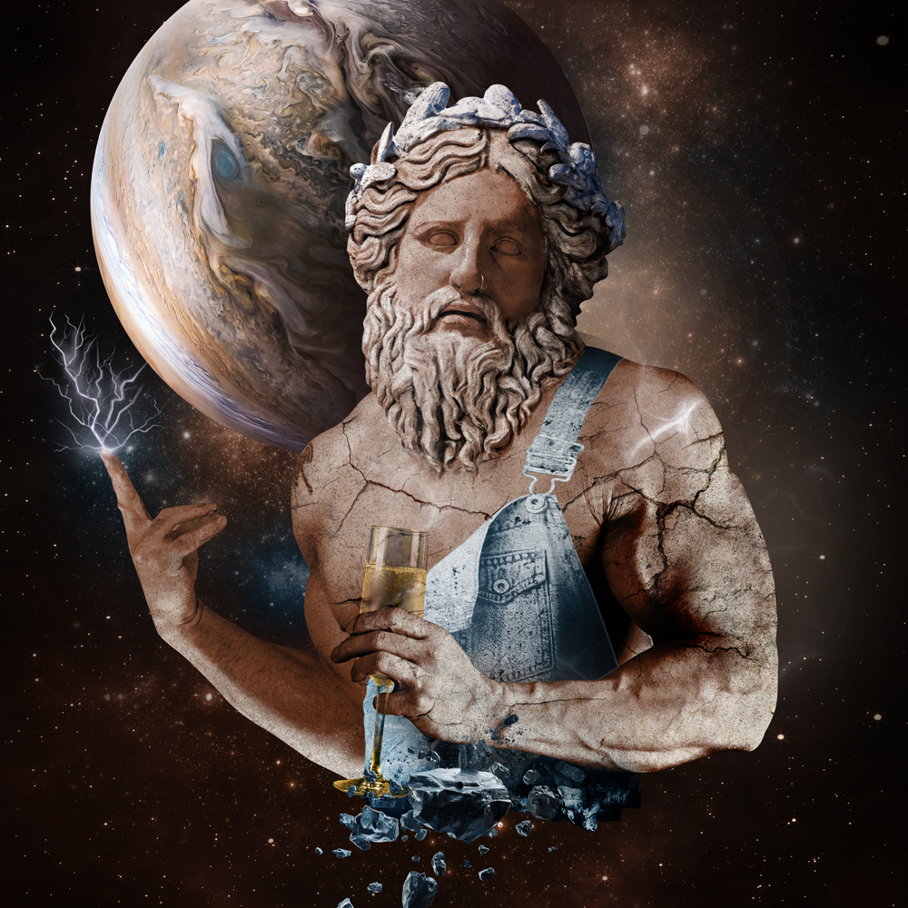 We see Jupiter not as a distant myth, but as a modern icon of “clout” and style. He wears contemporary luxury items that catch the light. This “divine flex” replaces his traditional lightning bolts with markers of modern wealth. The artwork asks if our modern brands have become our new idols. It challenges the viewer to look at the illusion of status through these false markers. This version of Jupiter represents the ultimate cosmic trendsetter.
